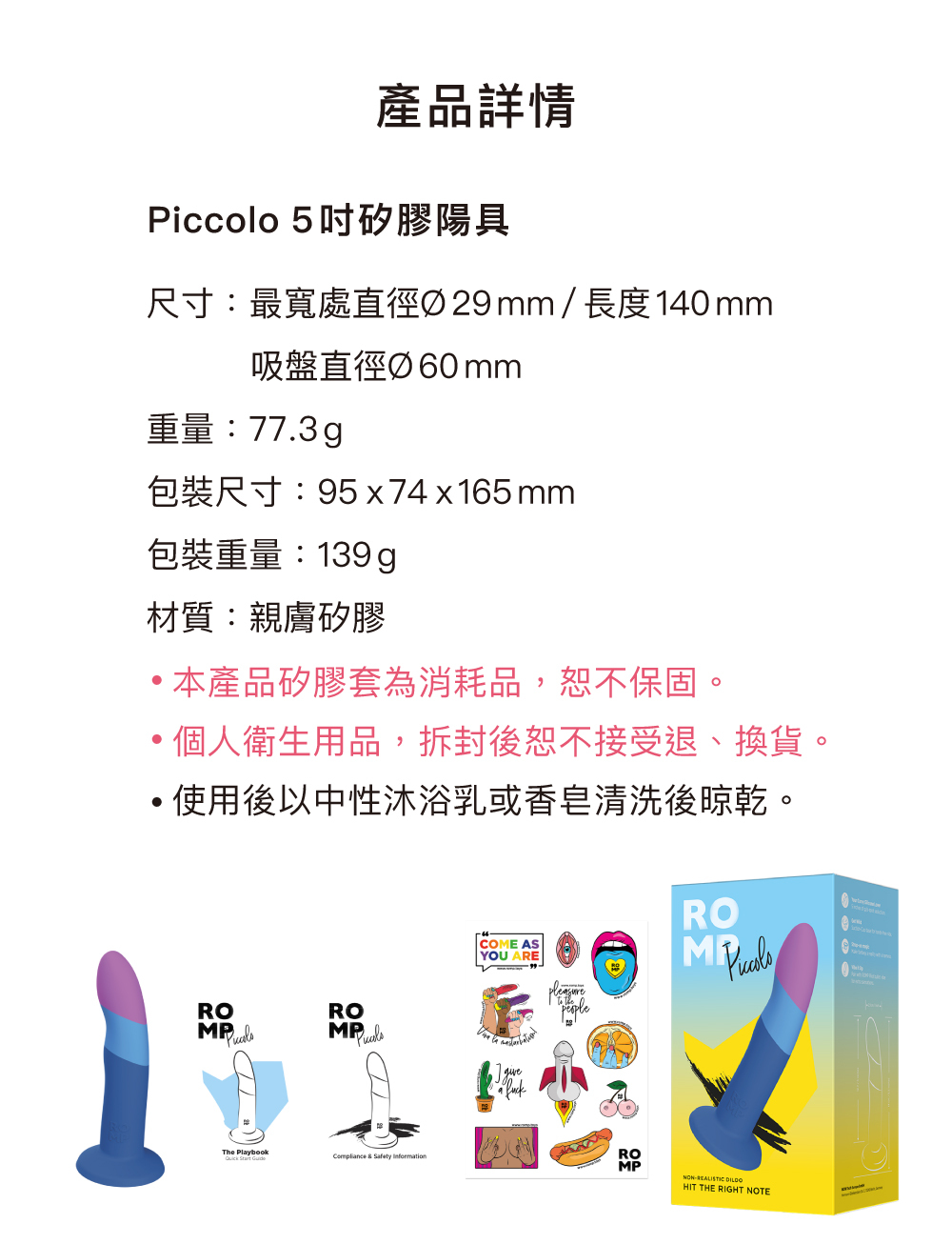 ROMP Piccolo 活力繽紛、大膽有趣的前衛色彩,獨樹一格、令人耳目一新,帶領你享受夢寐以求的冒險。彎曲設計、内層堅實外層柔軟,絲滑般誘惑給予你最舒適的真實感,同時堅挺又飽滿!