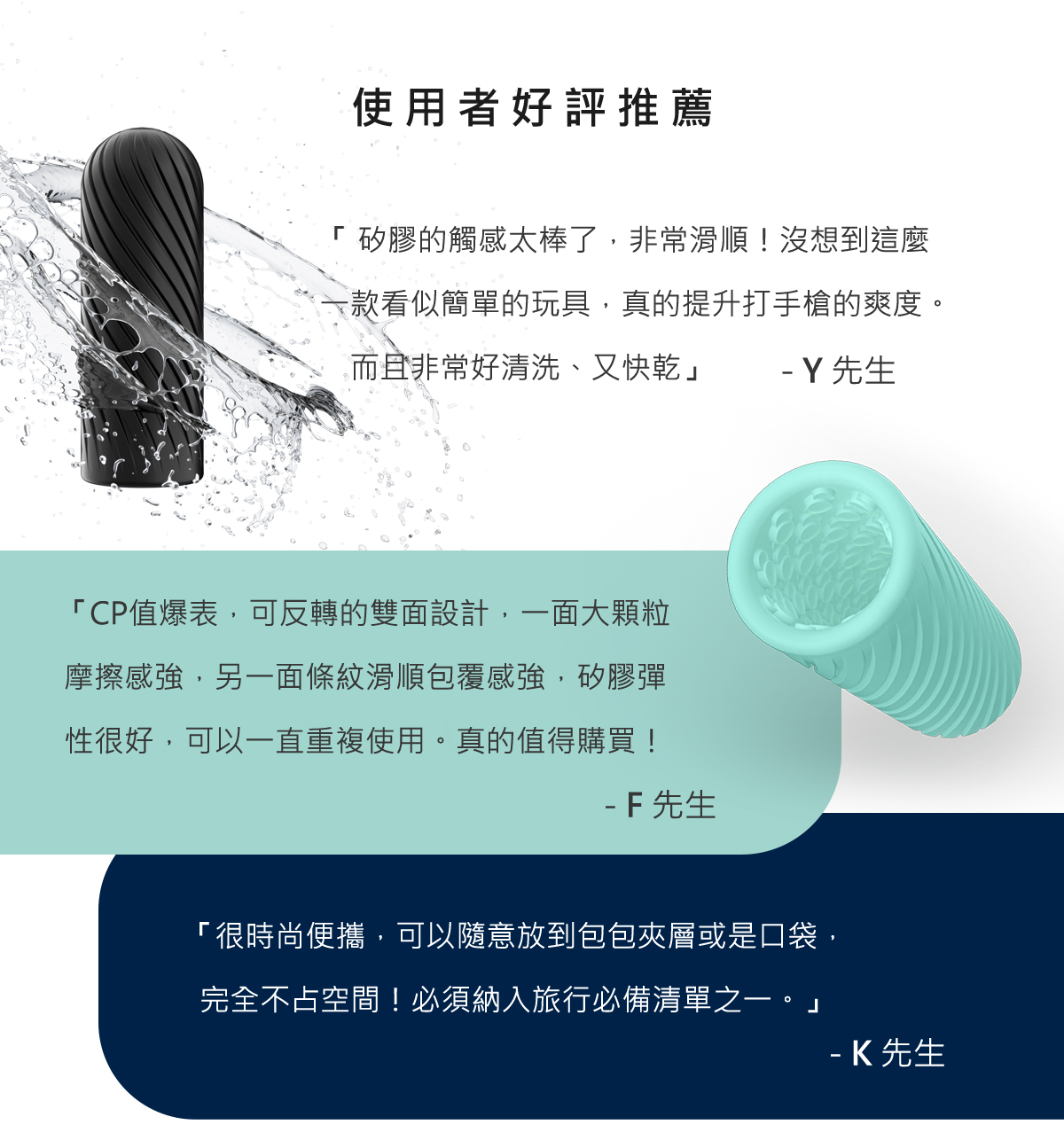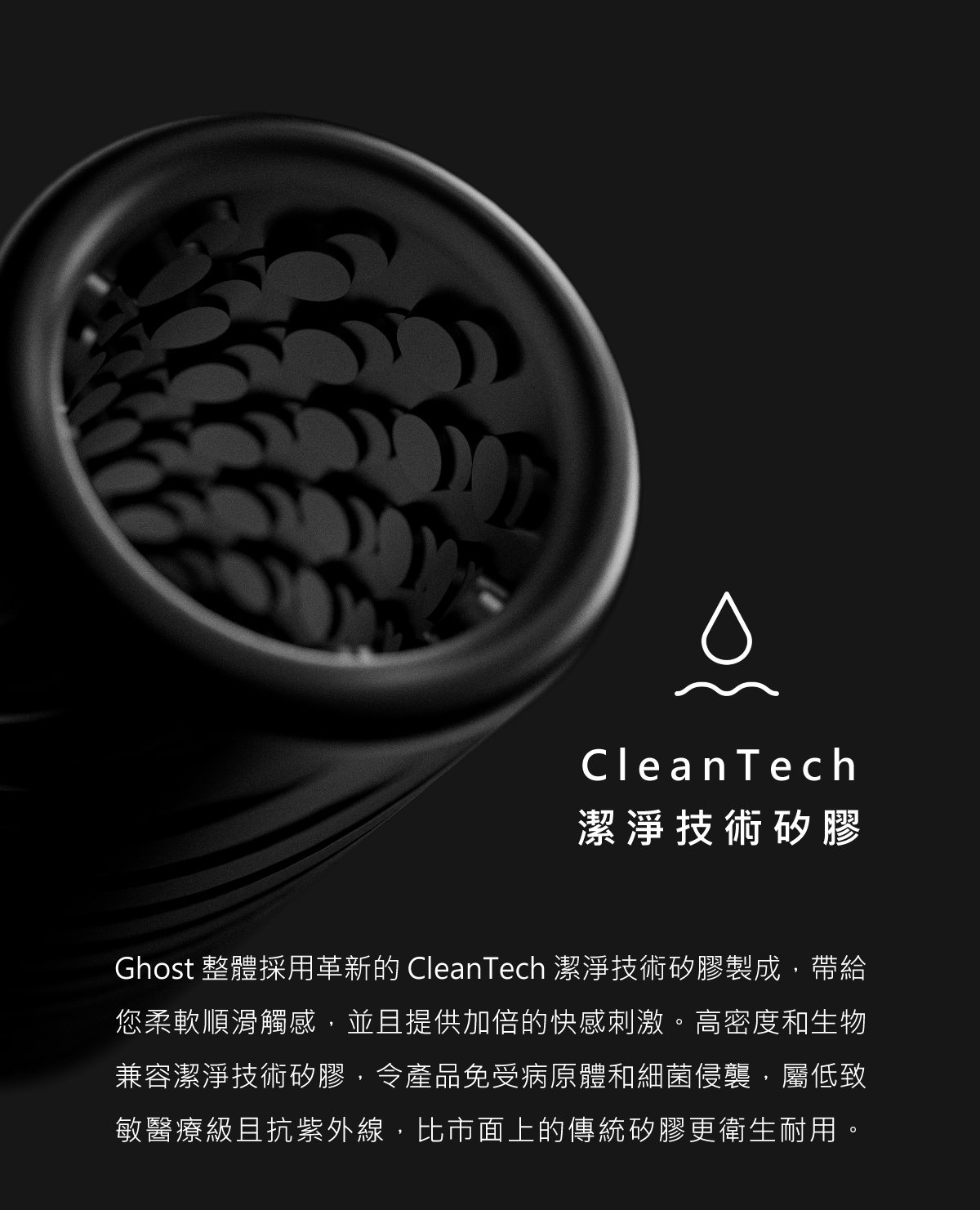 CleanTech 矽膠帶來絲滑細密柔軟的真實觸感,且與一般自慰蛋不同、採符合人體工學的筒狀造型,Ghost 同時實現緊緻包覆與輕鬆掌控!雙面不同的浮凸樣式,翻轉就可讓快感加乘,告別公式化的自慰。備有具通風孔設計特製收納盒,盒內還具有專用固定架,確保透氣衛生、容易收納。