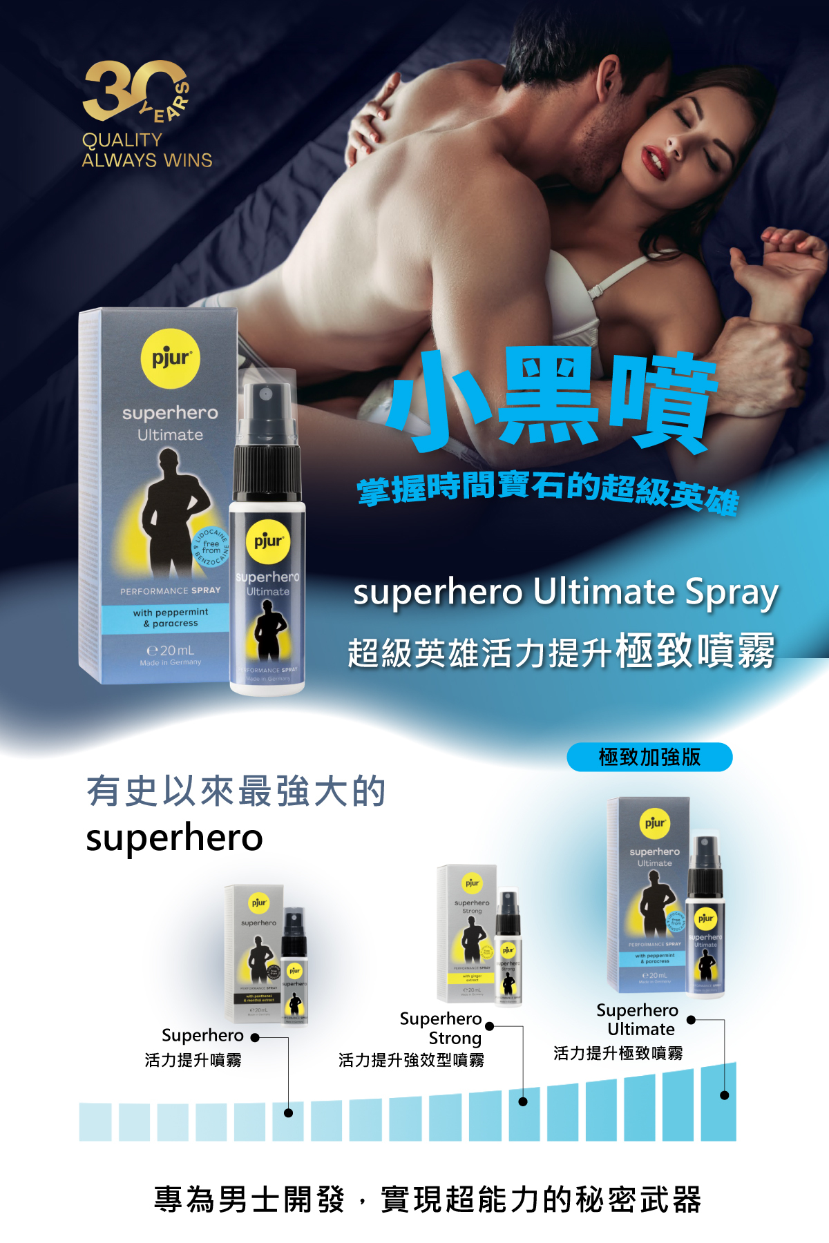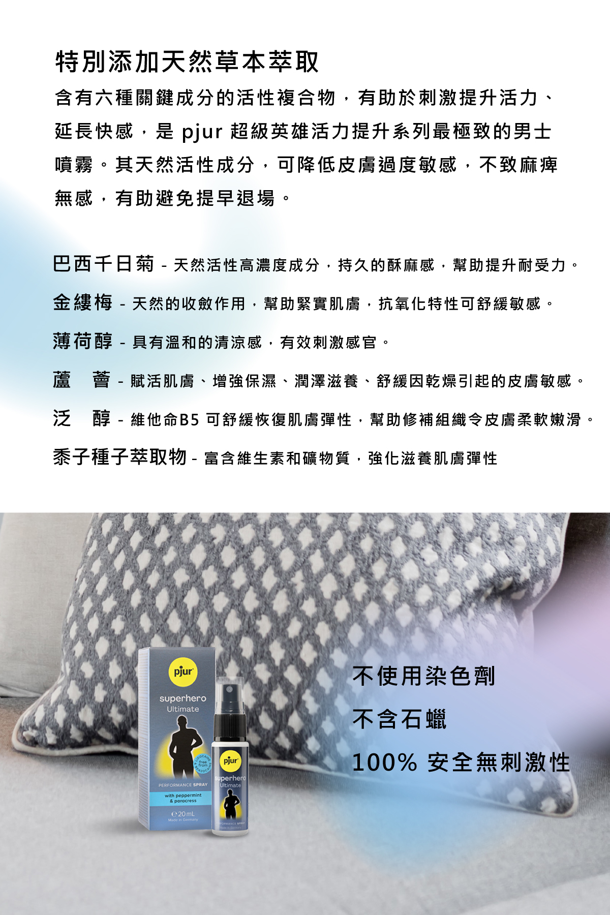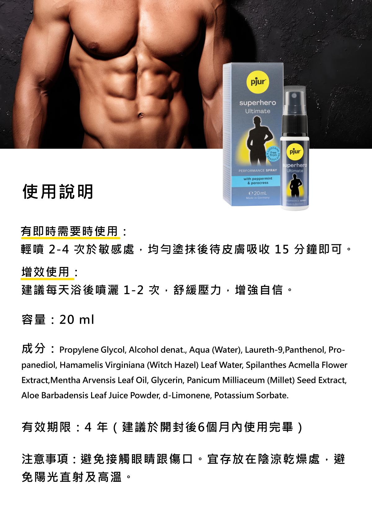 ——有史以來最強大的superhero,專為男士開發,實現超能力的秘密武器。添加天然草本萃取,含有六種關鍵成分的活性複合物,有助於刺激提升活力、延長快感,是pjur 超級英雄活力提升系列最極致的男士噴霧。其天然活性成分,可降低皮膚過度敏感,不致麻痺無感,有助避免提早退場。
