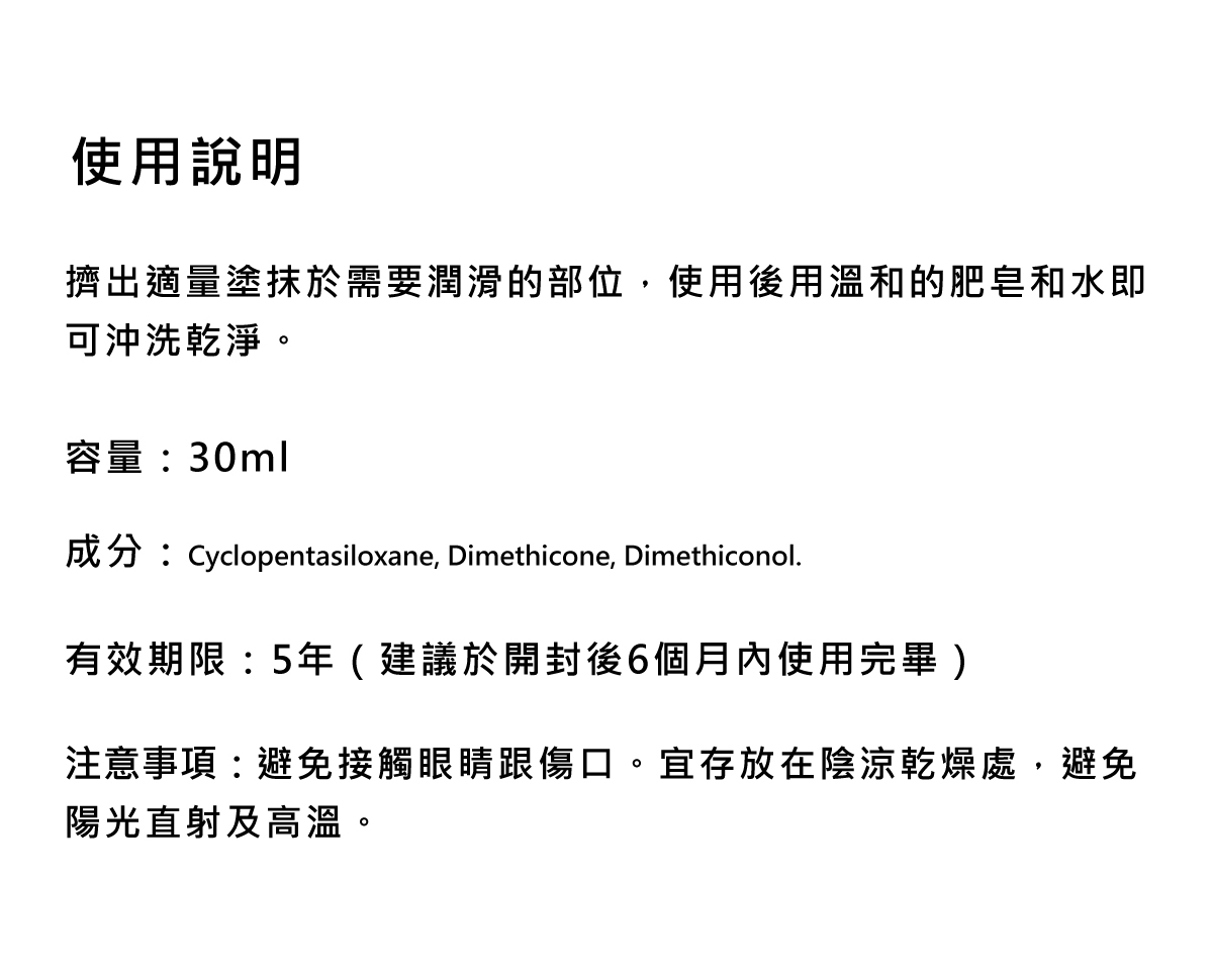 優質濃縮矽性配方具卓越的保濕效能,有機矽分子只會停留在皮膚表面,不會被吸收,提供長效潤滑的體驗。潤滑度持久不沾黏、不乾澀,不會黏膩,可以緩解陰道乾澀的症狀,並且有效的保護和護理肌膚。只需塗抹幾滴,即可達到理想的潤滑,是性愛和按摩的最佳選擇。